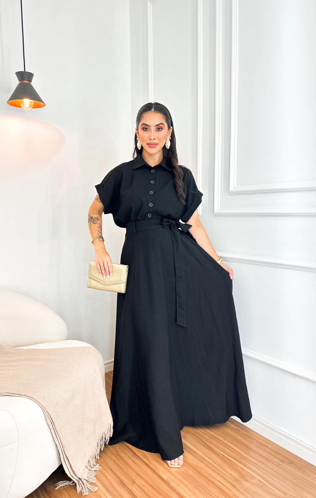 A peça é confeccionada em tecido de alta qualidade, possui modelagem valorizando a silhueta, caimento impecável e acabamento refinado. A blusa, com design que remete à elegância de uma camisa, possui decote em V discreto e mangas, oferecendo um toque clássico e versátil. O comprimento da blusa é tradicional, na altura da cintura, garantindo proporção perfeita com a saia. A saia longa, por sua vez, apresenta cintura alta marcada por um prático lastex, que garante ajuste perfeito e conforto sem abrir mão da beleza.