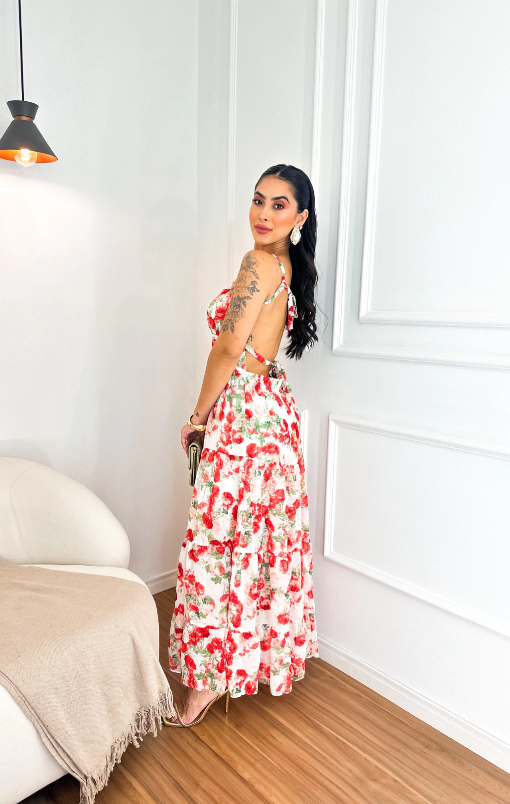 A peça é confeccionada em tecido leve e fluido de alta qualidade, com estampa floral exuberante em fundo claro. A modelagem é longa e esvoaçante, valorizando a silhueta com leveza e caimento impecável. O acabamento é refinado, com a saia estruturada em camadas que conferem volume e movimento.
